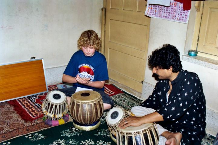 Will, taking a tabla lesson with Gourisankar, at Gourisankar's house in Srirampur, near Kolkata.